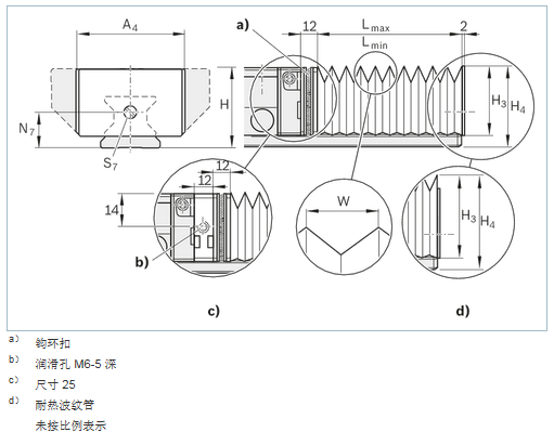 波纹管是预装配好的。包含了紧固螺丝。可使用滚珠滑块的润滑嘴。