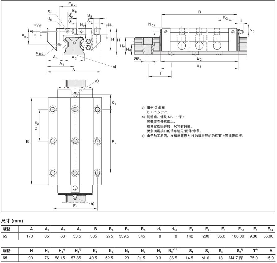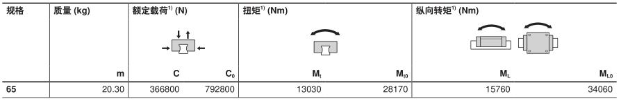 1) 额定动载荷和动转矩是按照 DIN ISO 14728-1 以 100 000 m 行程为基准确定的。实际中经常是以 50 000m 行程为基准。比较:根据表格数值 C、M t 和